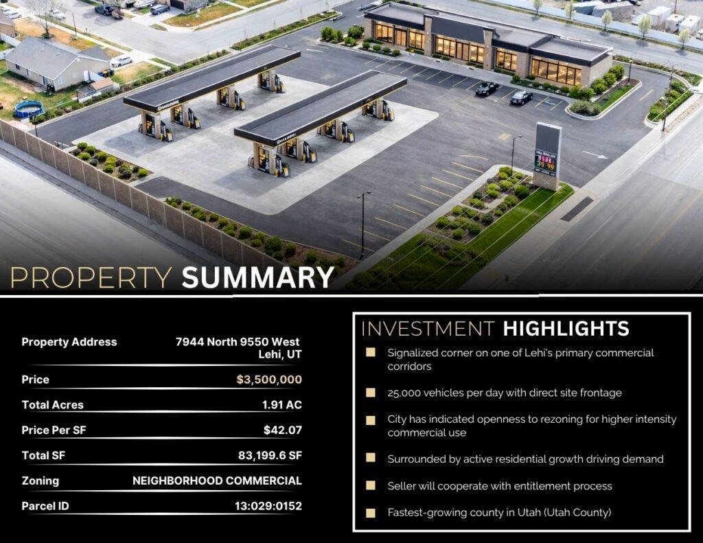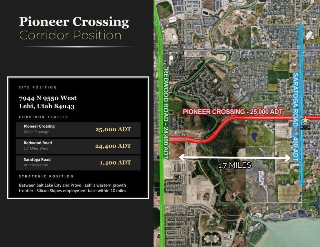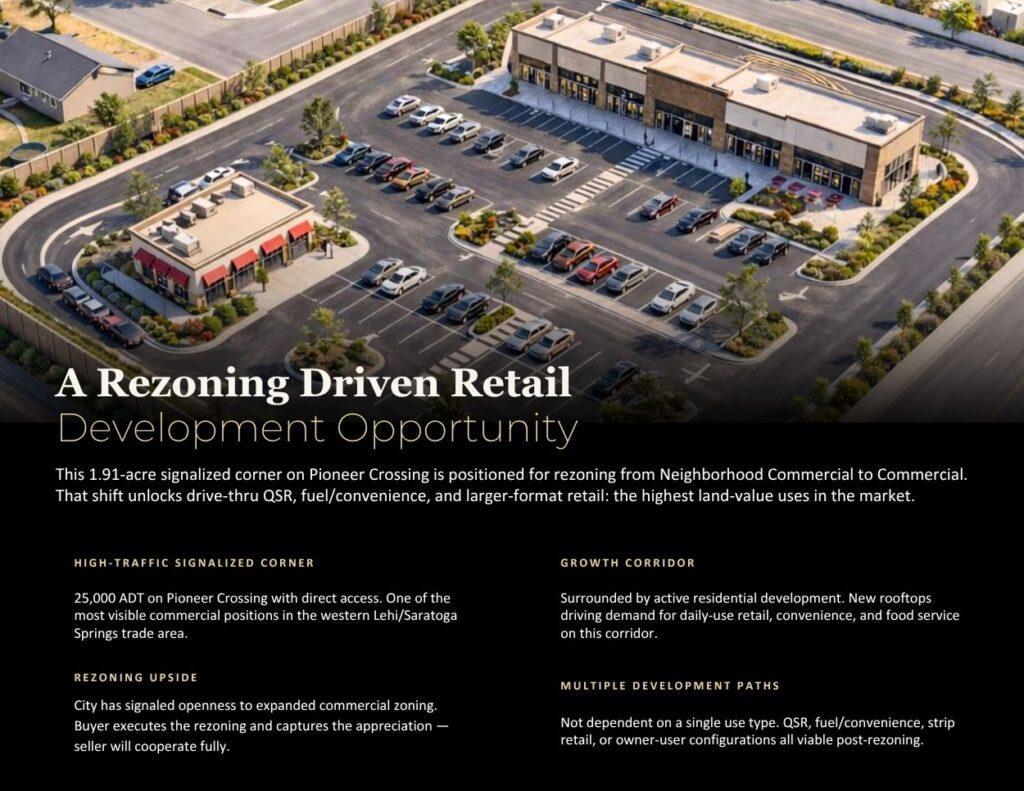 This 1.91-acre land opportunity offers a prime position in Lehi, Utah along the busy Pioneer Crossing corridor, one of the area’s most active and visible commercial routes. With strong traffic exposure and convenient access, the property is well suited for a variety of development possibilities in a rapidly growing market.